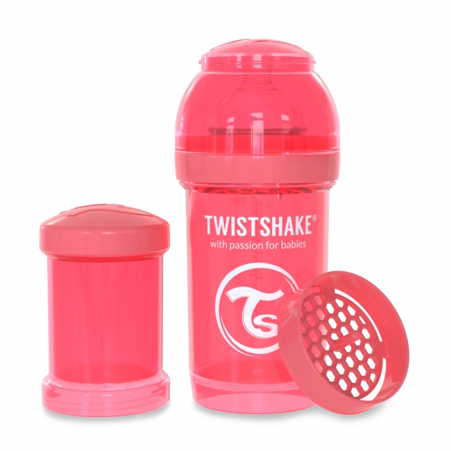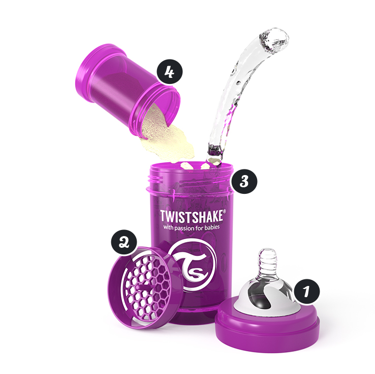 Twistshake nappflaska är perfekt att använda i kombination med amning. I varje twistshake ingår en praktisk behållare och ett mixernät. Det unika systemet TwistFlow motverkar kolik och bidrar till ett jämt flöde. Flaskan har en bred hals som gör den lätt att rengöra. Greppvänlig design med tjock plast som håller värmen.