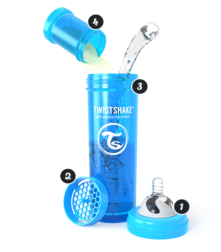 Twistshake nappflaska är perfekt att använda i kombination med amning. I varje twistshake ingår en praktisk behållare och ett mixernät. Det unika systemet TwistFlow motverkar kolik och bidrar till ett jämt flöde. Flaskan har en bred hals som gör den lätt att rengöra. Greppvänlig design med tjock plast som håller värmen.