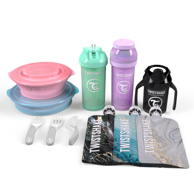 Is your child still bff with the bottle but ready to start eating more by her- or himself? Make the first dining experience a little extra lovely with our colorful plates, spill-free sippy cups and ergonomic cutlery. Straw cup, squeezebags and baby bottle are included, and you will have (voila) everything for the snack too!